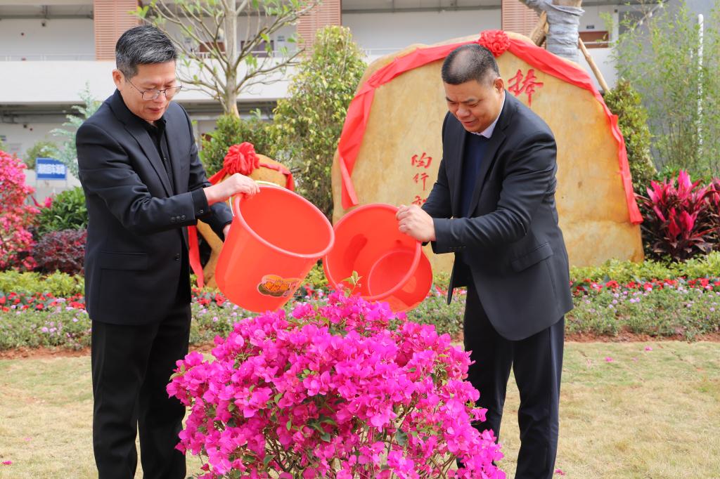 2月26日上午,广州龙川商会捐赠绿化景观揭幕仪式在河源校区举行。学校副校长苏晖、学校原党委副书记黄晋生,广州龙川商会会长邓玉宇及商会代表,河源校区管委会负责人和相关工作人员等出席了揭幕仪式。