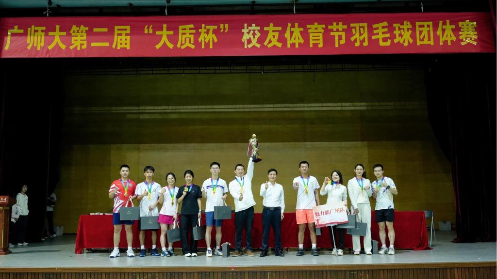 本届赛事设男双1队、男单1队、70+混双2队4个项目。各参赛队伍在一天的赛程中展开激烈角逐,选手们精湛的球技和精彩对抗赢得了现场观众的阵阵掌声。经过激烈比拼,“魅力新广州队”凭借出色表现夺得团体冠军,“潮汕队”荣获亚军,“惠州队”与“佛山一队”并列季军。“文武双全”“广州享玥队”“一拍即合队”及“佛山二队”四支队伍获得并列第五名。比赛对前八名队伍予以奖励,校友办(基金办)主任罗继全、体育与健康学院副院长黄善球、羽毛球专任教师李利、校友羽毛球俱乐部唐荣生会长分别为获奖队伍颁奖。