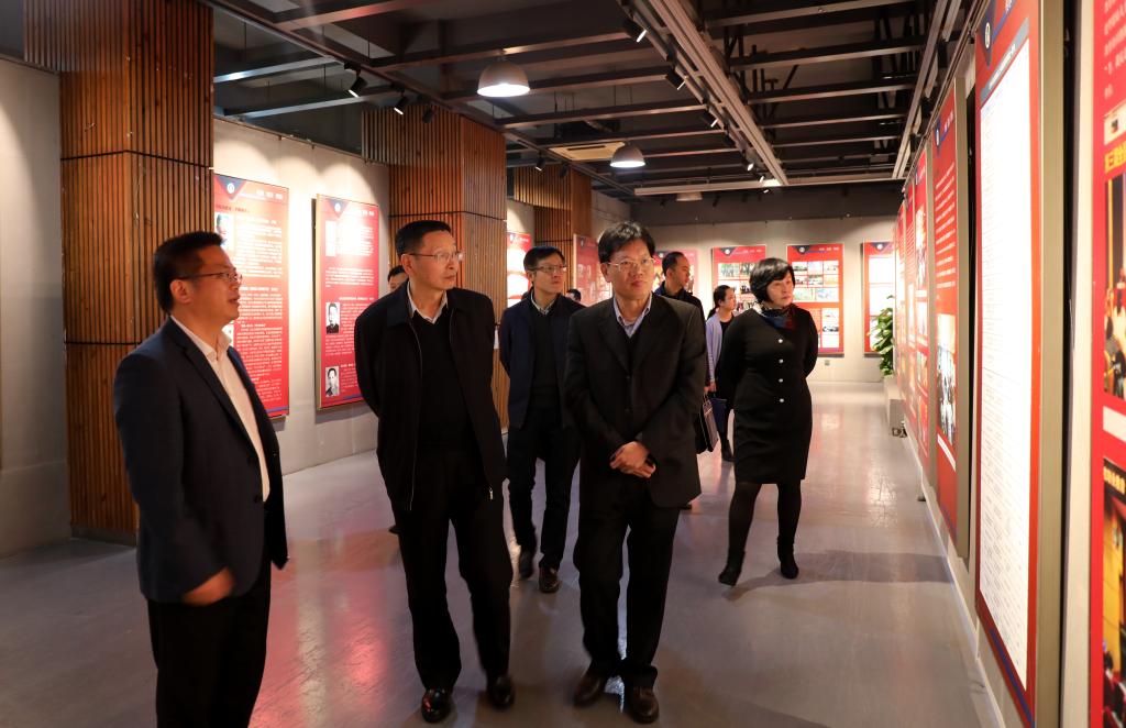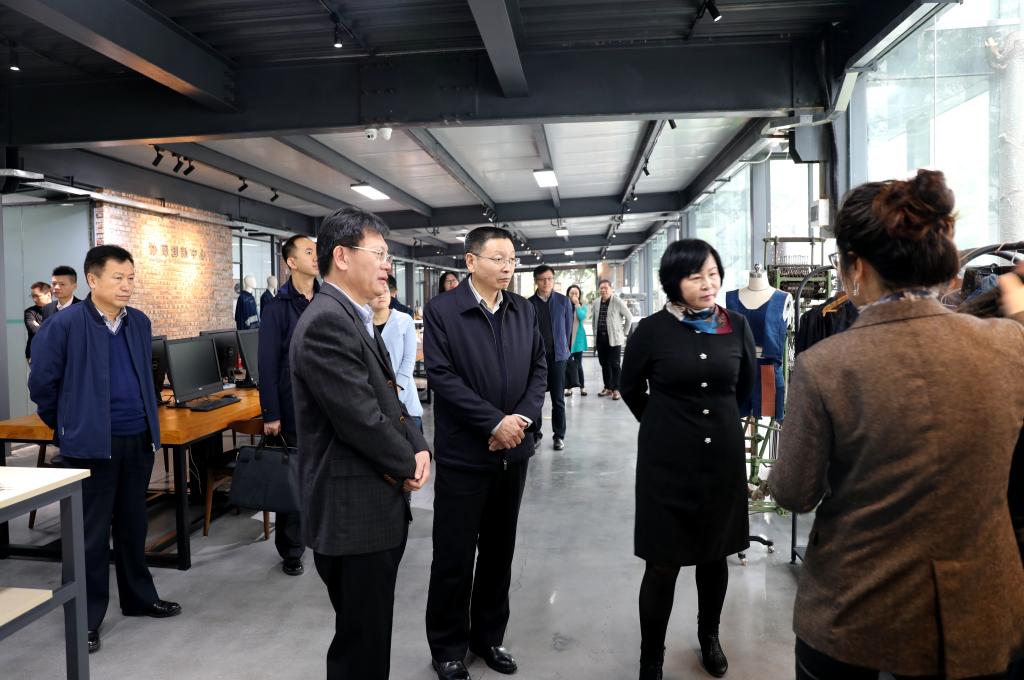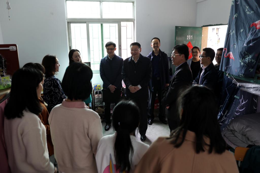 薛继海一行人在凌靖波、贺勇的陪同下参观了我校校史展和“非遗传承大师工坊”,还深入学生宿舍走访看望学生。(学生处)