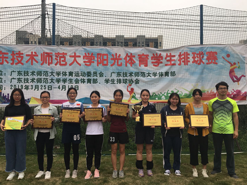 2019年广东技术师范大学“阳光体育”学生排球赛,经过8天48场激烈角逐,于4月2日在白云校区顺利结束。电子与信息学院、外国语学院分别获得男、女组总冠军,自动化学院、管理学院、机电学院、计算机科学学院、财经学院、汽车与交通工程学院、光电工程学院分别获得男子组第二名到第八名;计算机科学学院、文学与传媒学院、机电学院、管理学院、汽车与交通工程学院、光电工程学院、电子与信息学院分别获得女子组第二名到第八名。学校体育运动委员部分委员、体育部相关负责人、排球赛指导老师等观看了比赛并在赛后为获奖运动队颁奖奖杯、奖牌、运动员成绩证书。