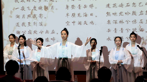 晚会伊始,一支古典舞蹈《彩云追月》引领我们走进风姿绰约的世界。暖场舞蹈后,诗词朗诵比赛决赛将第五届“三月桃芳,曲水流觞”三月三诗歌节推向了高潮。