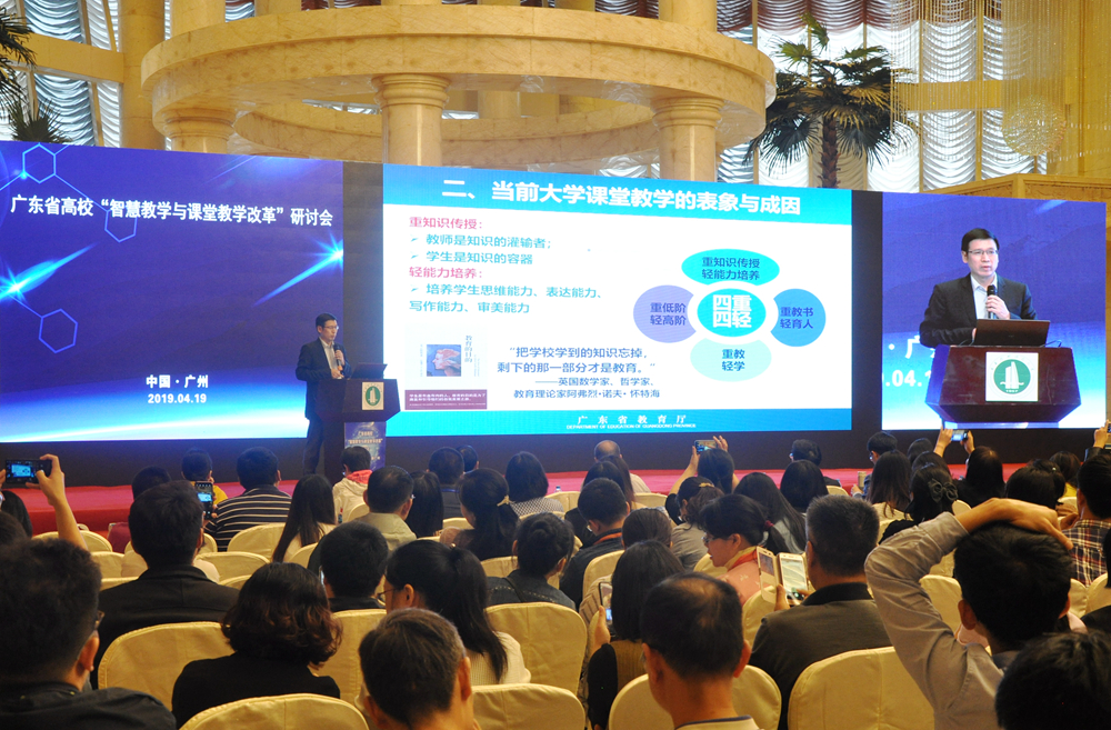 广东省教育厅高教处处长郑文作了题为《一流本科人才培养质量——基于大学课堂教学模式革命的思考》的专题报告。指出一流高等教育需要一流课堂教学,一流人才培养的关键在于提高课堂教学质量、重点在于主阵地课堂教学;他分析了当前大学课堂教学存在的“重知识传授、轻能力培养”“重教书、轻育人”“重教、轻学”“重低阶、轻高阶”等“四重四轻”现象及成因,进而提出从牢固树立学生中心理念、开展多样化的课堂教学模式改革、改革课堂教学评价机制和完善课堂教学模式改革的支持体系等4方面给出改革的具体思路和指导意见。