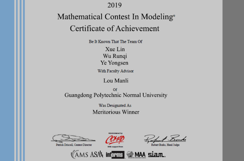 日前,2019年美国大学生数学建模竞赛与交叉学科数学建模竞赛(MCM&ICM)成绩揭晓,由我校数学与系统科学学院薛琳(2016数师2)、吴润琪(2016数师2)、叶勇森(2016计本2)组成的参赛队(指导老师:娄曼丽)获国际一等奖(Meritorious Winner)1项,另外8支参赛团队获国际二等奖(Honorable Winner)。
