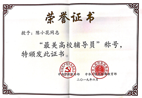 由中宣部、教育部组织评选的2019年“最美高校辅导员”“最美大学生”日前揭晓,我校文学与传媒学院辅导员陈小花光荣当选“最美高校辅导员”。