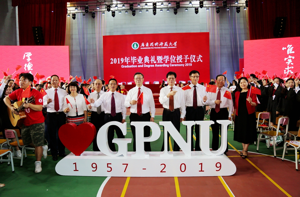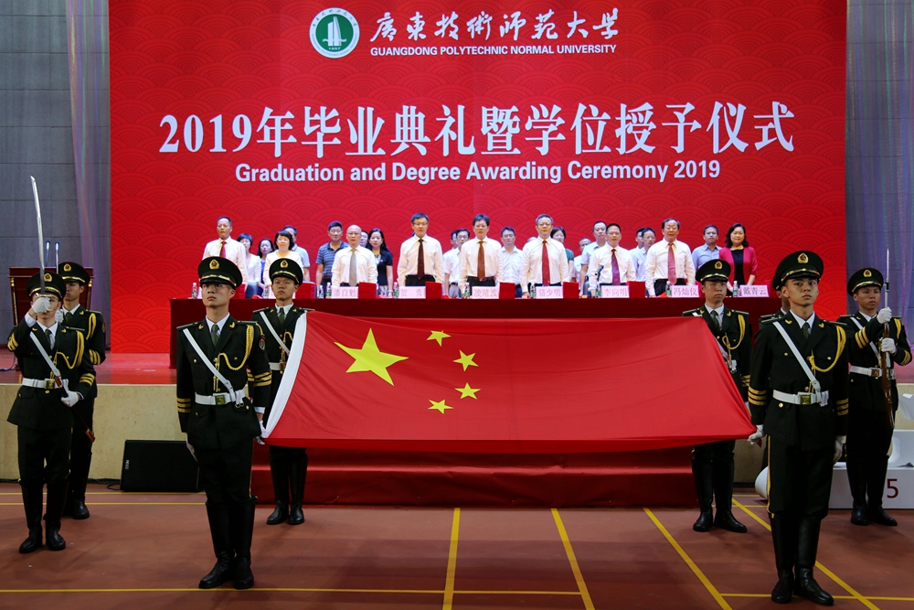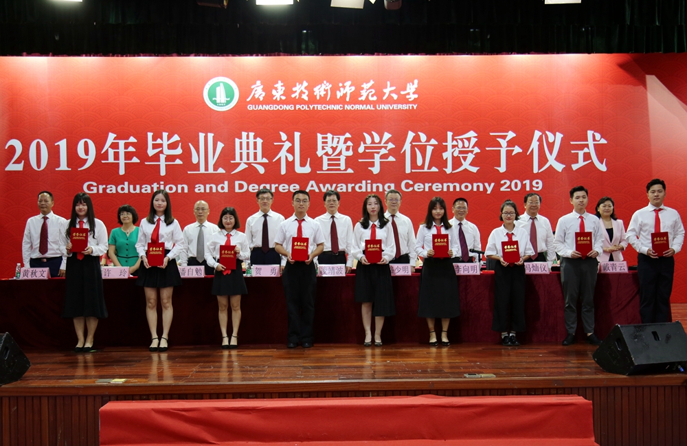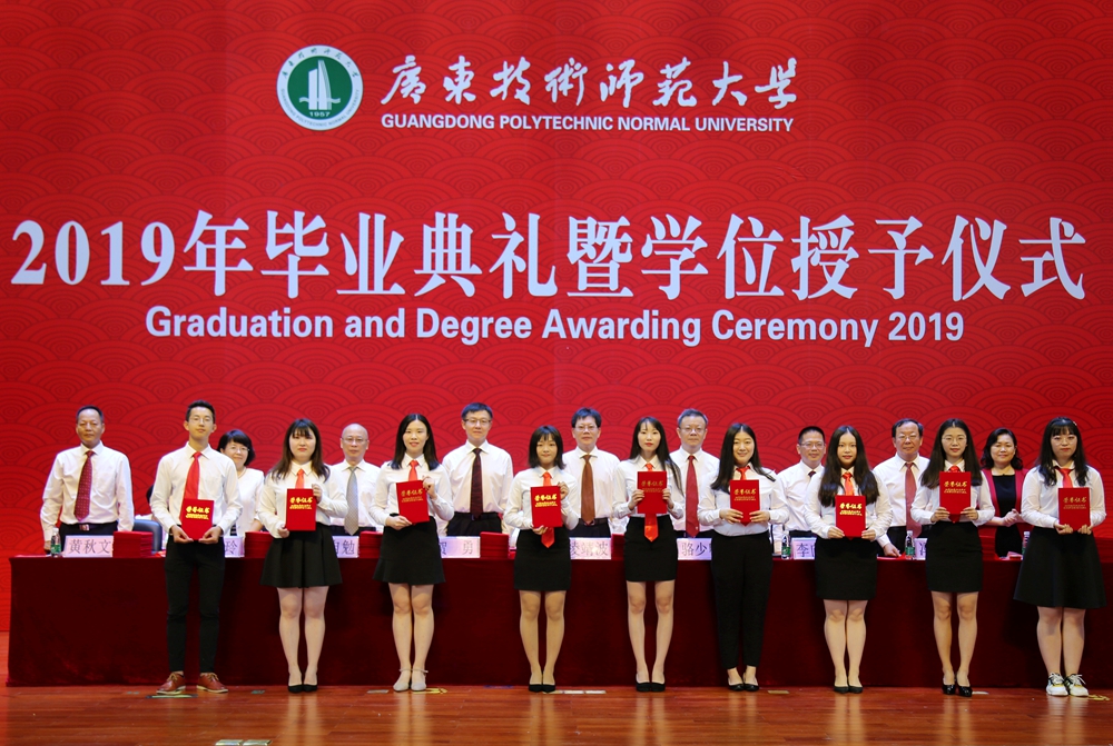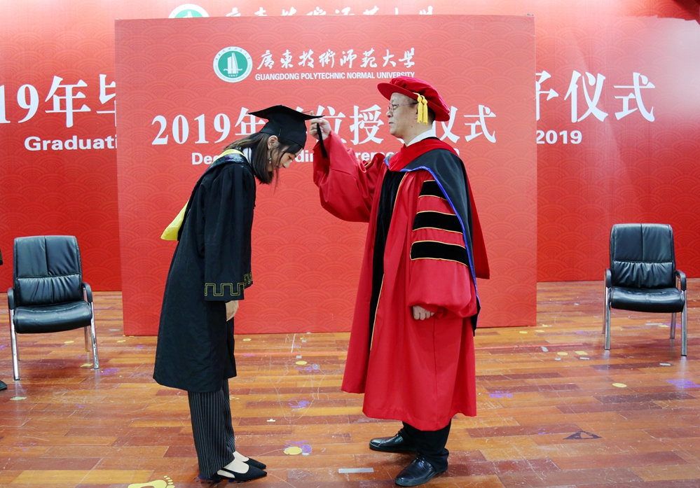 骆少明表示,去年我校成功更名大学,实现了学校发展历程中里程碑式的历史跨越。骆少明祝贺第一届拿到广东技术师范大学毕业证、学位证的2019届毕业生,并希望同学们尽快转变角色,适应社会环境,学会与人共事,沉下身心做事,真正做到做人负责任、讲诚信,做事讲原则、有担当;拥有家国情怀,志存高远,把个人的理想抱负融入中国梦、强国梦,为民族作贡献、与祖国同进退;坚持勤学善思,创新发展,要在工作中敢于创新、善于创新,扬长避短,凸显自己的工作优势,不断自我超越,努力成为行家里手,实现个人可持续发展;继续昂扬向上,奔跑前行,要敢于拼搏、敢于追求,保持“初生牛犊不怕虎”的冲劲,一往无前,在爬模滚打中找到自己的生命价值和人生方向;锤炼品德修养,行稳致远,谨记我校“厚德博学,唯实求新”的校训,始终保持内心的真善美,不断提升人格和思想境界。