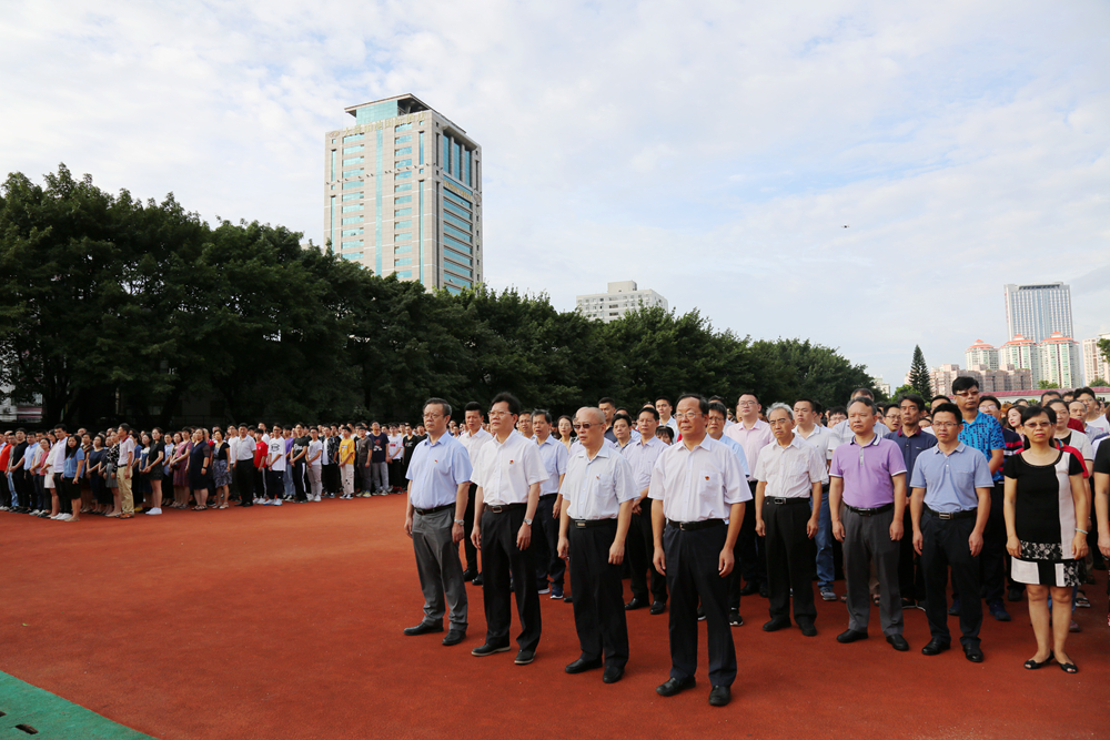 9月2日是我校2019秋季学期开学的第一天。为进一步加强爱国主义教育,培育和践行社会主义核心价值观,激发爱国爱党热情,根据《广东省教育厅关于开展“我为祖国升国旗”主题教育活动的通知》精神,我校举行“升国旗,唱国歌,向国旗敬礼”活动。全体校领导,机关各(部)处全体员工、各学院领导班子、全体辅导员和学生代表2000多人齐聚东校区田径场,怀着激动与喜悦的心情,凝望五星红旗冉冉升起,祝福伟大祖国繁荣富强。学校党委副书记李向明主持仪式。