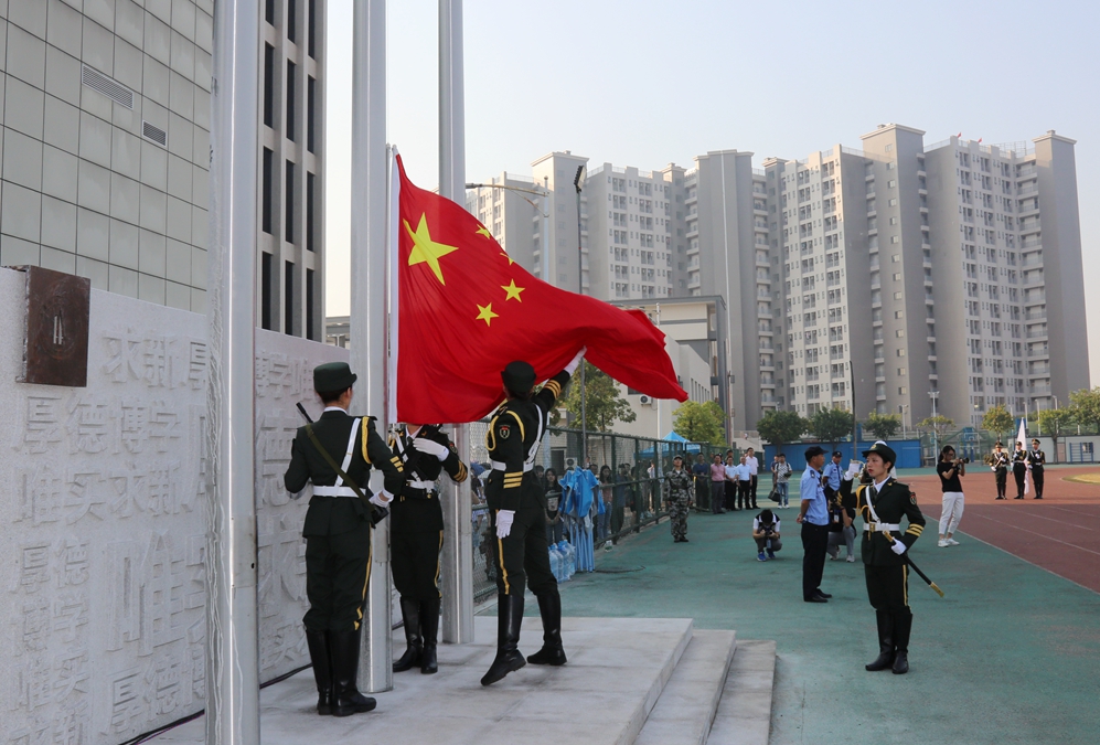 在现场指挥员发出迎校旗的口令后,护旗手在全场人员的注视下完成了出旗仪式。在雄壮的国歌声中,2019级新生军训总结表彰大会拉开了帷幕。
