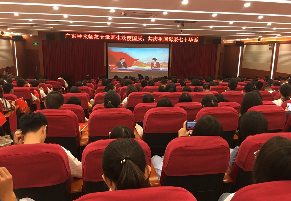 在东校区一教208报告厅、白云校区三教讲学厅,学校领导李向明、许玲与广大在校师生一起,集中收看了此次庆祝活动现场直播。庆祝大会举行了升国旗仪式,当国旗冉冉升起,在场师生肃然起立,共唱国歌,通过歌声为祖国母亲庆生。会上,中共中央总书记、国家主席、中央军委主席习近平发表重要讲话。会场迅速掀起了学习领会习近平总书记重要讲话精神热潮。广大师生纷纷表示,要以习近平总书记的讲话精神为指引,更加紧密地团结起来,不忘初心,牢记使命,继续把我们的人民共和国巩固好、发展好,继续为实现“两个一百年”奋斗目标、实现中华民族伟大复兴的中国梦而努力奋斗!阅兵仪式上,当59个方(梯)队有序经过天安门城楼后,会场内掌声雷动,久久不息。新时代革命军人的新风貌,国防和军队建设新成就令人心潮澎湃、倍感自豪。在群众游行过程中中,《今天是你的生日,中国》等经典歌曲,唤醒了师生的历史记忆和社会共同情感,全体师生再次起立为祖国深情歌唱。