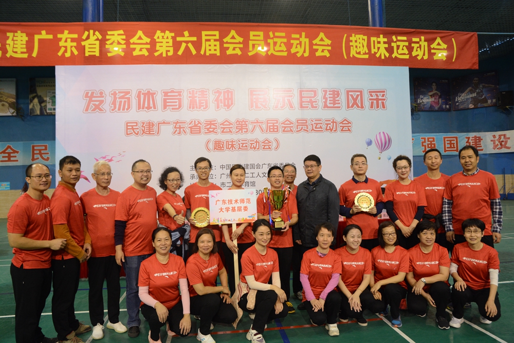 为庆祝新中国成立70周年、人民政协成立70周年、中国共产党领导的多党合作和政治协商制度确立70周年,加强民建广东省委会与各基层组织间的广泛交流,充分展示民建会员良好精神风貌,推动民建自身建设健康发展,11月30日,民建广东省委会在广州市第二工人文化宫举办“发扬体育精神,展示民建风采”为主题的第六届会员运动会(趣味运动会)。民建广东技术师范大学基层委员会20余人参加了运动会,经过激烈角逐,获“摸石过河”和“同舟共济”单项2个第一名、“一马当先”单项第二名、“超级战车”单项第三名和“稳步前进”单项第四名,并以6项团体竞赛项目总分第一的成绩斩获团体冠军。民建广东省委员会副主委鲁晓明、组织处处长江秋英分别为团队冠军、亚军、季军和单项第一名颁奖并与大家合影留念。