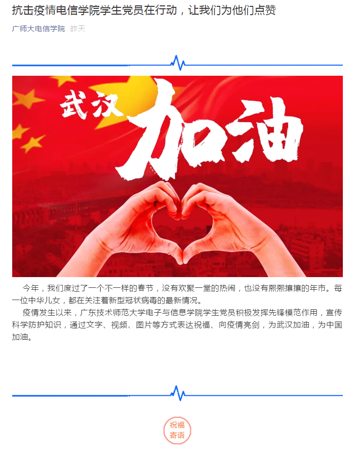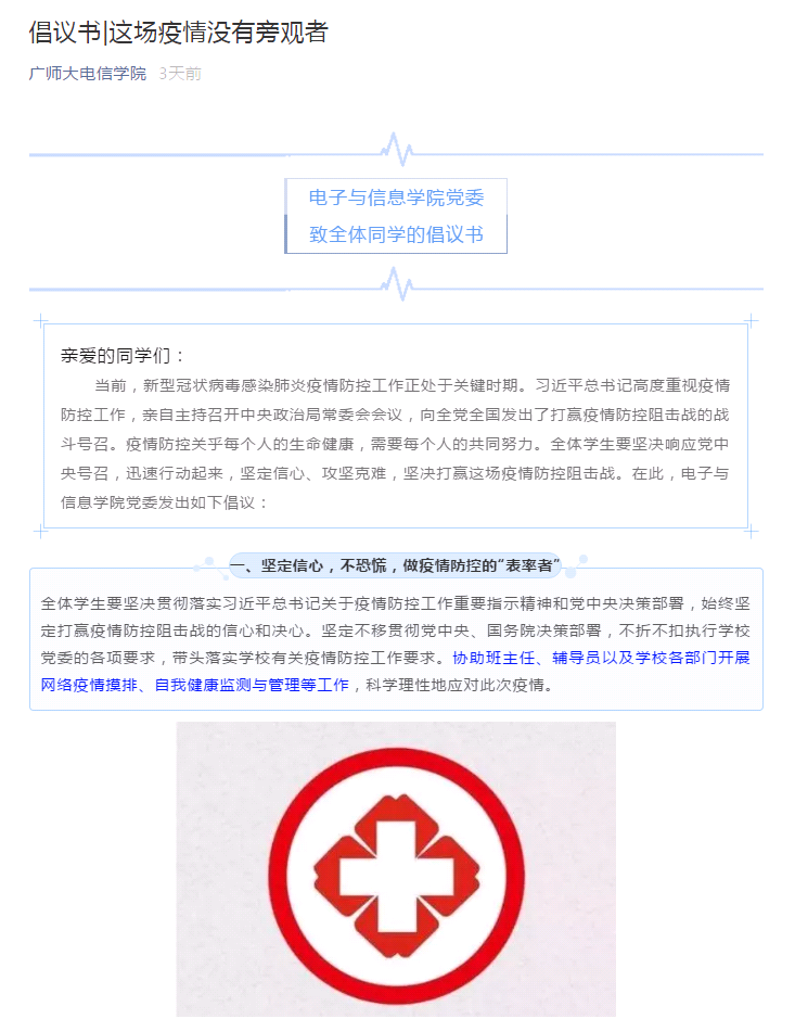 二是“书信”为媒,循循善诱,引导学生主动应战。学院党委通过微信公众号发布《这场疫情没有旁观者——电子与信息学院党委致全体同学的倡议书》,从坚定信心不恐慌、以身作则强防范、坚守阵地听指挥、做好规划学好习这四个方面出发,引导学生勇于做疫情防控的“表率者”“宣传者”“践行者”和“好学者”,主动战“疫”,积极投身疫情防控阻击战。