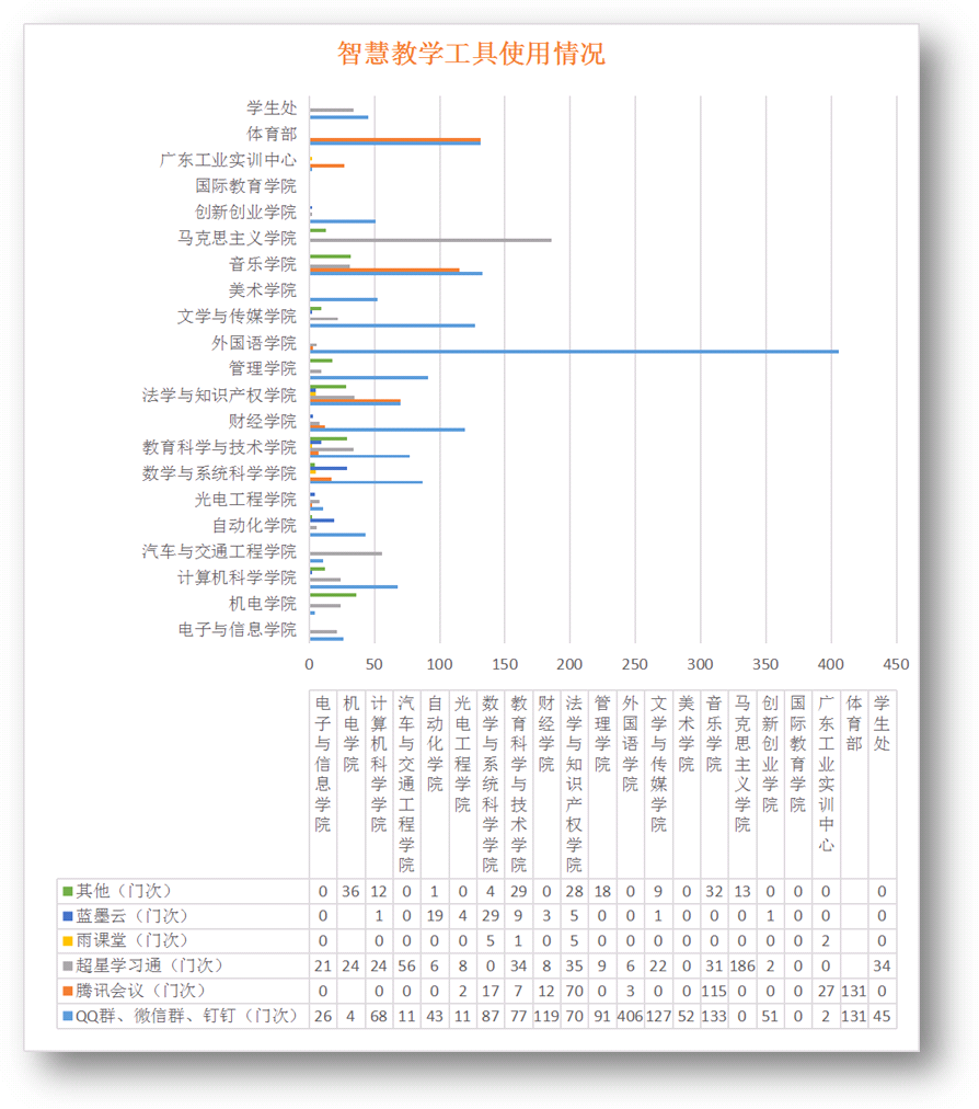 在线上教学前期准备阶段,各教学单位对智慧教学工具使用情况开展了摸底调查。目前主要借助在线课程资源、网络教学平台工具(慕课、超星学习通、雨课堂、智慧树等)和网络工具(如企业微信、QQ群、钉钉等)组织教学。