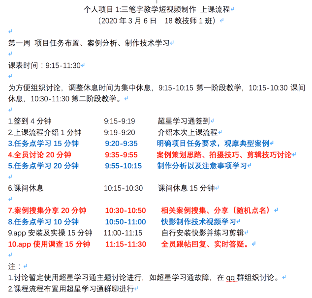 为避免课程冲突,按照教务处的要求,学生的上课时间必须严格依照课表时间来进行。确定不用直播方式上课后,我曾考虑过提前发布教学资源、学生提前自主学习、到课表时间再组织学生讨论的方法。考虑到未必所有学生都足够自律,难以明确掌握学生的学习状态等原因,在正式开课前一天,改用了定时发布任务点+限时讨论的方法。具体做法是:根据准备的课程资源,设定学习资源发放时间。例如准备的学习资源是13分钟,定时发布一个15分钟左右的任务点,随后根据这一任务点组织讨论,讨论限定时间,要求全部学生参加。配合签到、随机点名讨论、作业等,能够强制要求学生必须在规定的时间做规定的事情,避免学生“掉线”,可以较好地掌握学生的学习状态。为此,把学习资源分成任务点资源和拓展资源两大类,任务点资源必须在课上学习完成、拓展资源学生可以在课后自主完成学习。在此基础上,设计了每次课的上课流程。