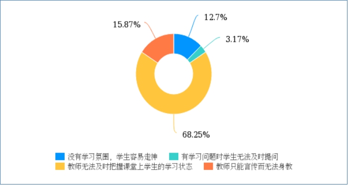 线上教学的不足,教师们认为主要是无法及时把握课堂上学生的学习状态,教师只能言传而无法身教,学习氛围相比课堂教学差,学生容易走神。