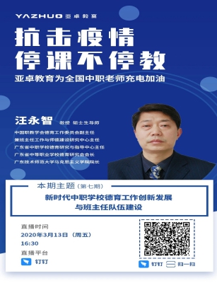 随着教育部“停课不停学”要求在全国各地的贯彻实施,很多平台、很多教育机构都开展了公益性的空中服务课堂,特别是应广大青少年学生不满足于只看只听现有录制好的课程、喜欢看直播的愿望,汪永智教授应邀于2020年3月13日下午4:30分开始在钉钉直播平台“亚卓大课堂”上了一个半小时的直播课。本活动由北京师范大学公民与道德教育研究中心、广东省中等职业学校德育研究会与亚卓教育共同举办,他以《新时代中职学校德育工作创新发展与班主任队伍建设》为题进行专题讲授。为了保证教学效果,他理清思路、沉着应战,在没有讲稿的情况下,全神投入、激情奉献,中间没有休息没喝一口水,一气呵成,受到听众的热烈欢迎和称赞。开播前半小时数千教师涌入直播群,钉钉直播平台只好临时又新开了4个直播群满足大家的需要,近2小时的直播中注册观看教师人数达到了6239人,参加听课的教师覆盖了全国18个省份的数百所中等职业学校,获互动消息2000余条,有45135次点赞。全国中职学校班主任基本功大赛一等奖获得者、广州市医药职业技术学校谢建玲老师听课后激动地说:“每次听汪教授讲课都会热血沸腾,汪教授传达新思想娓娓道来又振奋人心,真的很佩服汪教授把高大上的理论讲的这么接地气”。还有很多学校教师和广东技术师范大学的研究生、本科生通过电视投屏全家观看,有的学校组织全体教师集体或居家收看收听。如广东清远市职校组织了全校老师上线观看听讲,内蒙古自治区呼伦贝尔市莫旗职业教育中心组织全体校委会、环节干部、班主任、任课教师准时守候在电脑前收看专题讲座,江苏省建湖中专全体中层干部和班主任准时进入钉钉直播平台,参加全国“新时代中职学校德育工作创新发展与班主任队伍建设”在线培训。