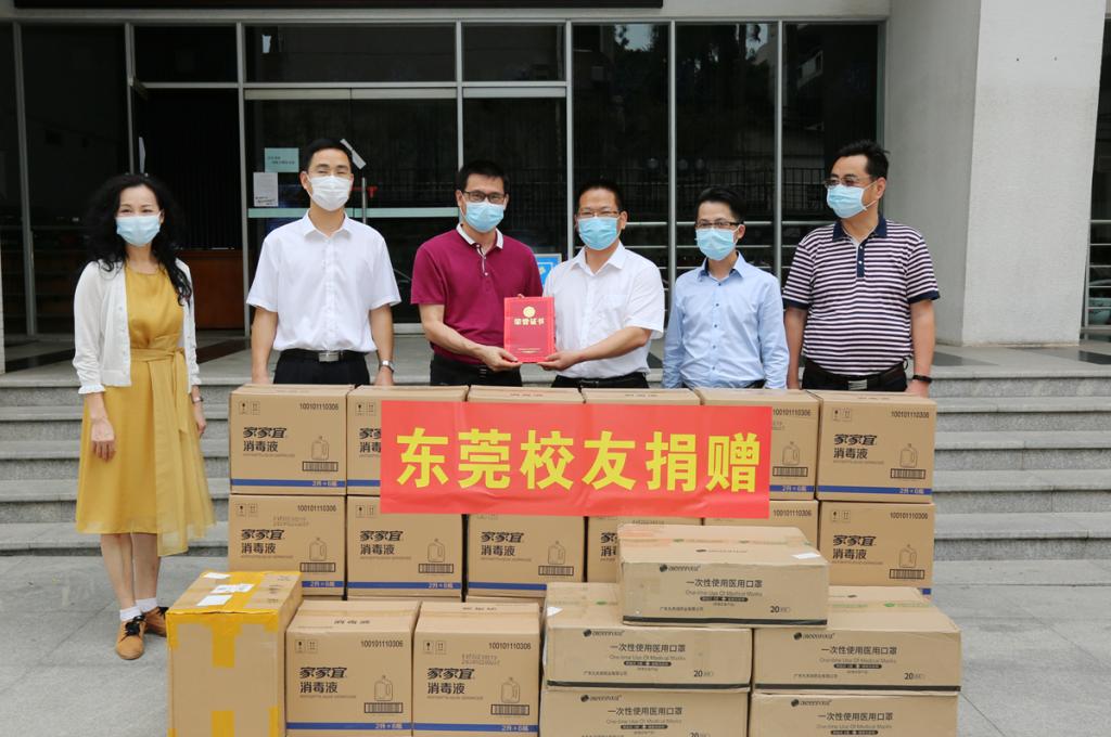东莞校友为母校捐赠手持红外额温枪20支、一次性口罩5000个、消毒液120瓶(2公斤/瓶)。由东莞校友联络处副主任、1991届校友、广东光正建设工程有限公司总经理邓力争,以及2006届校友,东莞市年例餐饮管理服务有限公司总经理朱建文送抵学校。