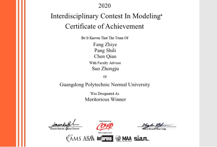 日前,2020年美国大学生数学建模竞赛与交叉学科数学建模竞赛(MCM&ICM)成绩揭晓。我校学子克服疫情困难,再创佳绩,2018级信计1班房志业、庞诗丽,数师2班陈潜(指导老师:孙中举)夺得国际一等奖(Meritorious Winner)。2018级数师2班陈林婷、黎颖琦,2018级软件1班吴龙凯(指导老师:孙中举);2017级数师1班陈恒、2017级信计班蓝衍斌、2017级数师2班蓝美琴(指导老师:彭雪);2017级通创2班冯林峰、卢凯欣、陈燕玲(指导老师:陈艳美);2018级大数据1班黄森鹏,2018级计本1班蒋郭凌峰、陈炜典(指导老师:蒋经华)等均获国际二等奖(Honorable Winner)。