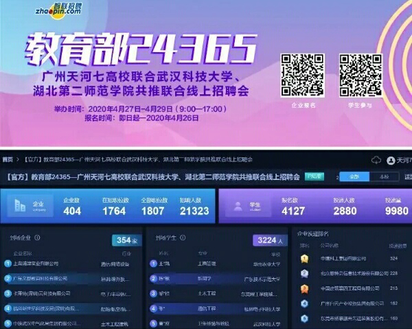 此外,我校还积极响应教育部号召,参加了教育部24365—广州天河七高校联合武汉科技大学、湖北第二师范学院共推联合线上招聘会。截至4月29日活动结束,共吸引到全国各地共计404家企业参会,共提供岗位1807个,总招聘需求达21323人,共吸引到3224名来自全国各地的毕业生报名参会。其中,我校毕业生报名参会比例达总报名人数12%。