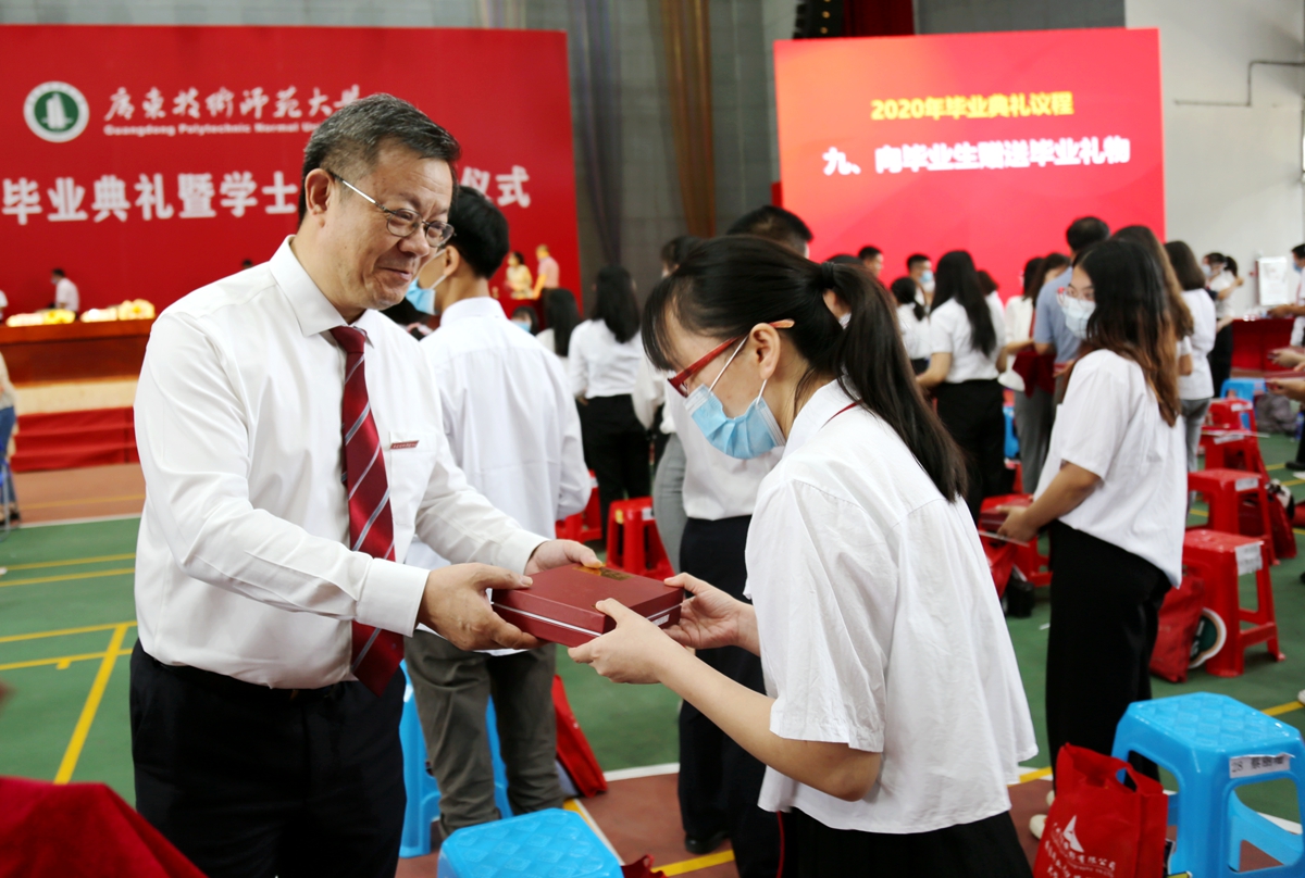 毕业典礼接近尾声时,全场师生起立齐唱《在成长中自强不息》校歌,昂扬的歌声飘荡在学生活动中心上空,鼓舞人心、催人奋进。全体校领导为毕业生赠送毕业礼物。至此,2020年毕业典礼在温馨热烈的氛围中圆满结束。