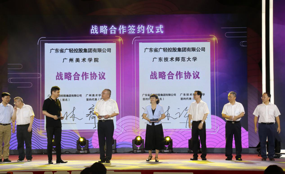 8月18日,由广东省广轻控股集团有限公司、广东广播电视台联手主办,广东省工艺美术协会、广东省工艺美术学会协办的“广东省广轻控股集团有限公司与广东广播电视台战略合作签署暨《国潮粤品》启动仪式”在广轻控股集团工美港隆重举行。学校党委书记凌靖波、副校长许玲率发展规划处、美术学院主要负责人出席了仪式,并代表我校与广轻控股集团签署了《产教融合发展战略合作框架协议》。