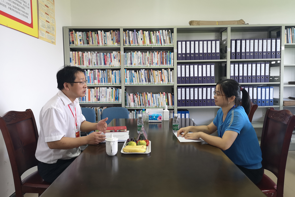 图为认证专家组成员刘细丰副教授与我校唐霏副教授进行深度访谈,了解毕业情况相关信息