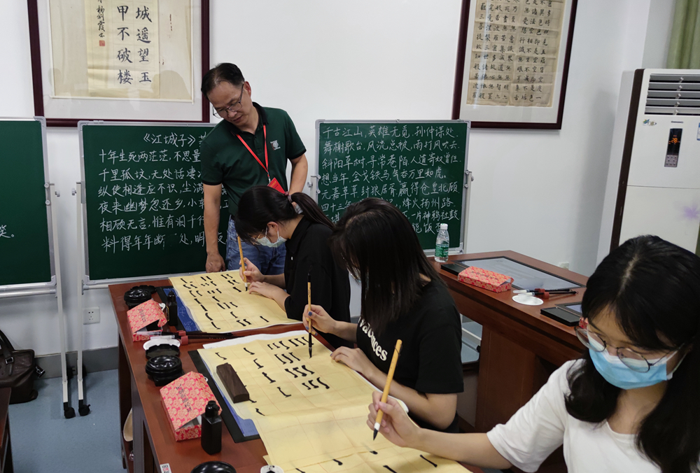 图为认证专家组成员王景魁(高级职称)认真观摩财务会计教育的《书法》(三笔字训练)课程授课情况