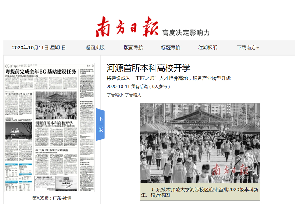 10月11日,《南方日报》第A05版以《河源首所本科高校开学:将建设成为“工匠之师”人才培养高地,服务产业转型升级》为题,对我校河源校区正式启用作了报道。原文链接:https://epaper.southcn.com/nfdaily/html/2020-10/11/content_7907797.htm。