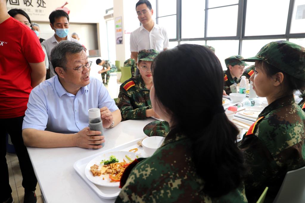 在观看了军训新生的实训表现后,骆少明来到荔园食堂与用餐的2020级新生亲切交谈。骆少明与同学们交流了来到河源校区后的生活和适应情况,听取同学们对于校区各项设施的改善意见。同学们纷纷表示,校长的慰问让大家感到十分感动和暖心,感受到了学校对学生的关心和重视,并表示在接下来的训练中会继续发扬不怕苦、不怕累的精神,完成军训各项要求,给自己和学校交上一份满意的答卷。