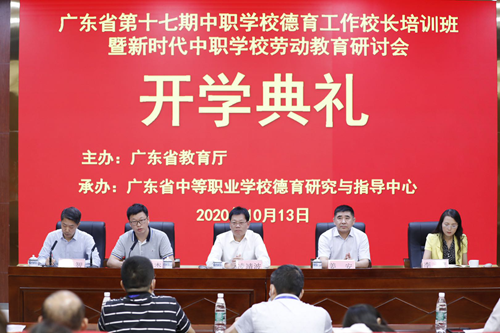 10月13日至15日,由广东省教育厅主办、广东省中等职业学校德育研究与指导中心承办的第十七期中职学校德育工作校长培训班暨新时代中职学校劳动教育研讨会在广东技术师范大学举行。广师大党委书记凌靖波,省教育厅思政处副处长关春杰,省中职德育中心主任、广师大马克思主义学院院长汪永智教授,广东技术师范大学党办主任、省文明风采主题活动策划部主任李琴教授出席开班仪式,来自全省各地120多名中职校长、副校长参加了会议。