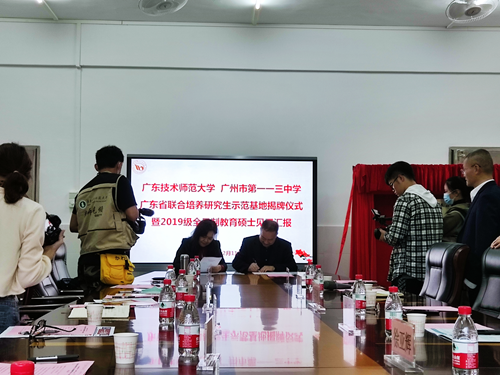12月11日,我校与广州市第一一三中学共建“广东省联合培养研究生示范基地”签约挂牌仪式在广州市第一一三中学举行,这是我校首个基础教育研究生联合培养省级示范基地。学校副校长戴青云,研究生处处长崔怀林、文学与传媒学院院长周卫忠、研究生处陈泳竹副处长,广州市第一一三中学校长程印贵、党支部书记刘利、副校长葛红霞、徐亚辉等出席了签约挂牌仪式。
