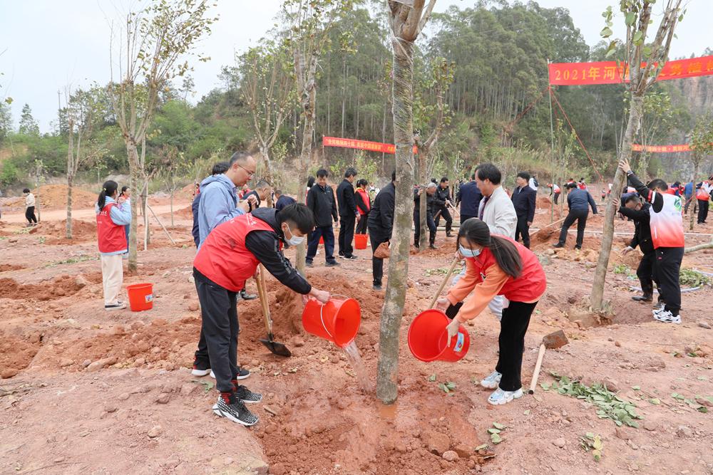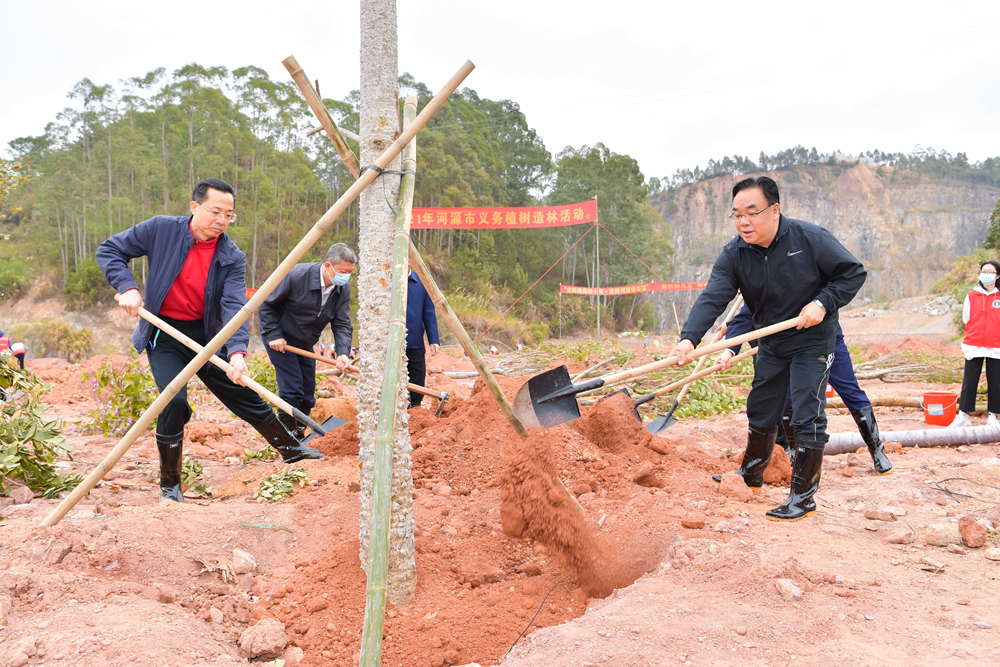 在河源校区内的植树点,丁红都、林涛、钟挥锷、吴善平等市四套班子领导与干部群众一道,挥锹铲土、扶苗培土、围堰浇水,共同河源校区植树添绿。一上午的时间,大家齐心协力、配合默契,共种植了香樟、桂花、木棉、宫粉紫荆、簕杜鹃等多个品种的乔灌木1000多株。