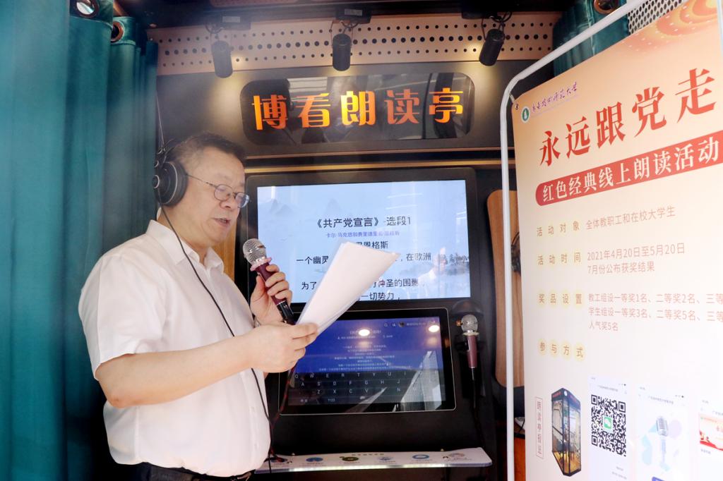 为庆祝中国共产党成立100周年,讴歌党的辉煌历程和丰功伟绩,推动党史学习教育走向深入,学校党委组织开展“永远跟党走”红色经典线上朗读活动。